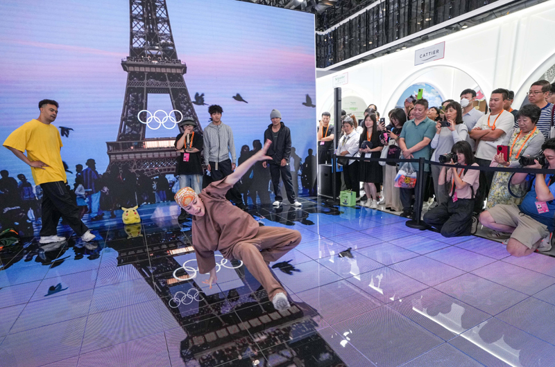 2024年9月14日,在2024年服貿會國家會議中心綜合展區(qū)的主賓國法國展臺,中法兩國街舞好手在表演霹靂舞。新華社記者 陳曄華 攝